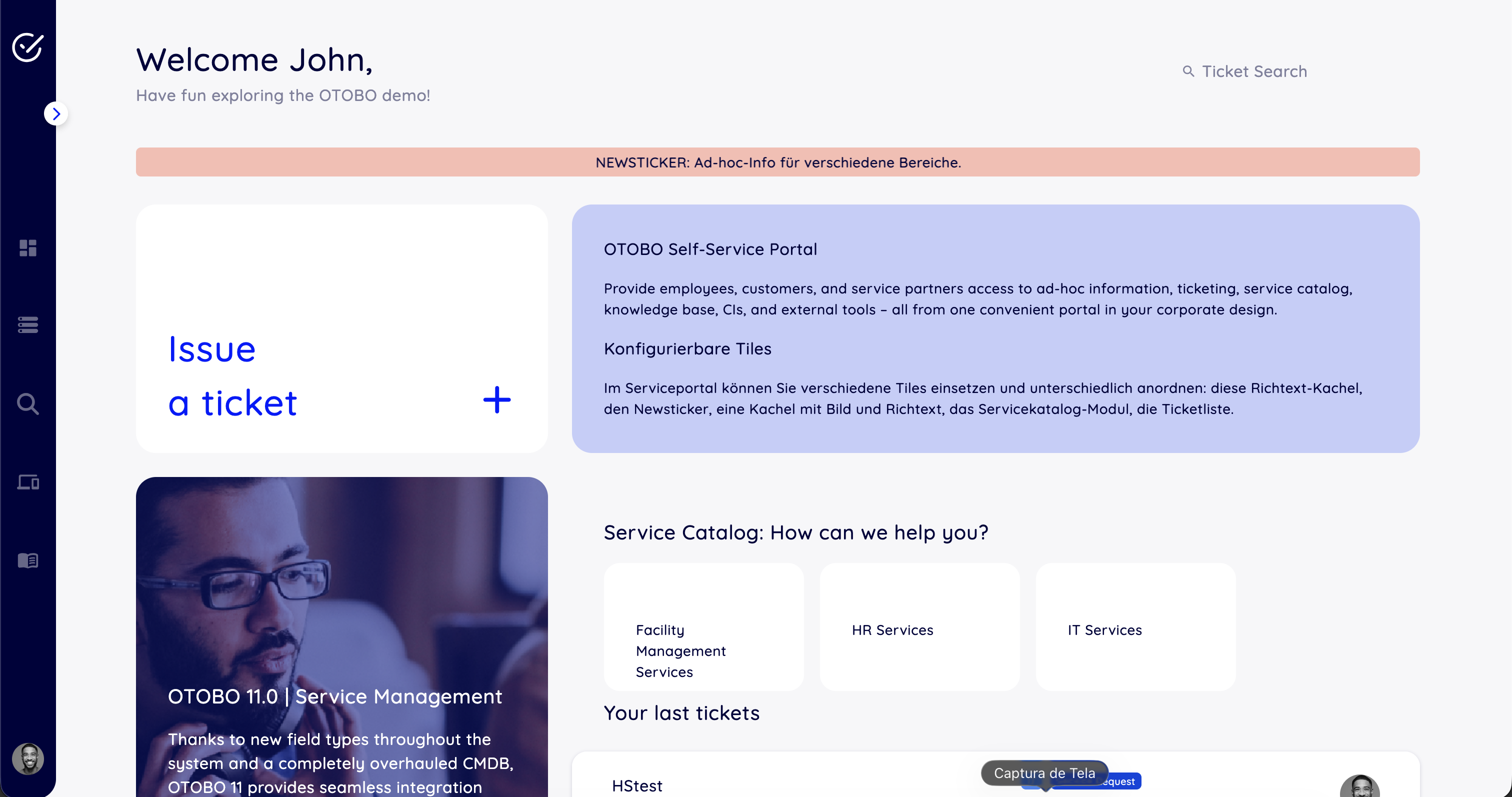 Já o segundo trata da tela dos usuários “comuns”. Esses sim serão nossos clientes e portanto, não devem ter acesso a todos os recursos do OTOBO. Apenas o que definirmos e permitirmos será exibido.